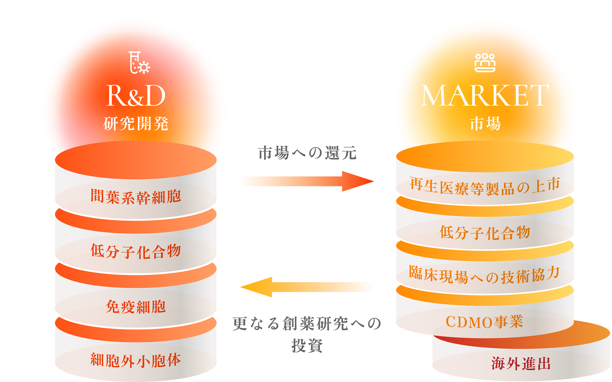 左に研究開発(R&D)、右に市場(MARKET)。R&Dの成果は「市場への還元」として右へ流れ、 市場で得た資金は「更なる創薬研究への投資」として左へ還流します。